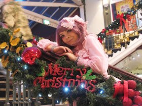 After a couple of hours inside the cafe, we took the train to Southport town centre and shopped and took some photos inside the Wayfarer's Arcade, which was all decked out for Christmas with decorations and carol singers. There was a Christmas-y balcony where I snapped some lovely shots of the girls, a huge Christmas tree, and an old-fashioned sweet shop. We also went inside the tights store and a shop selling parasols and umbrellas, as there were some very Loli-able finds.
